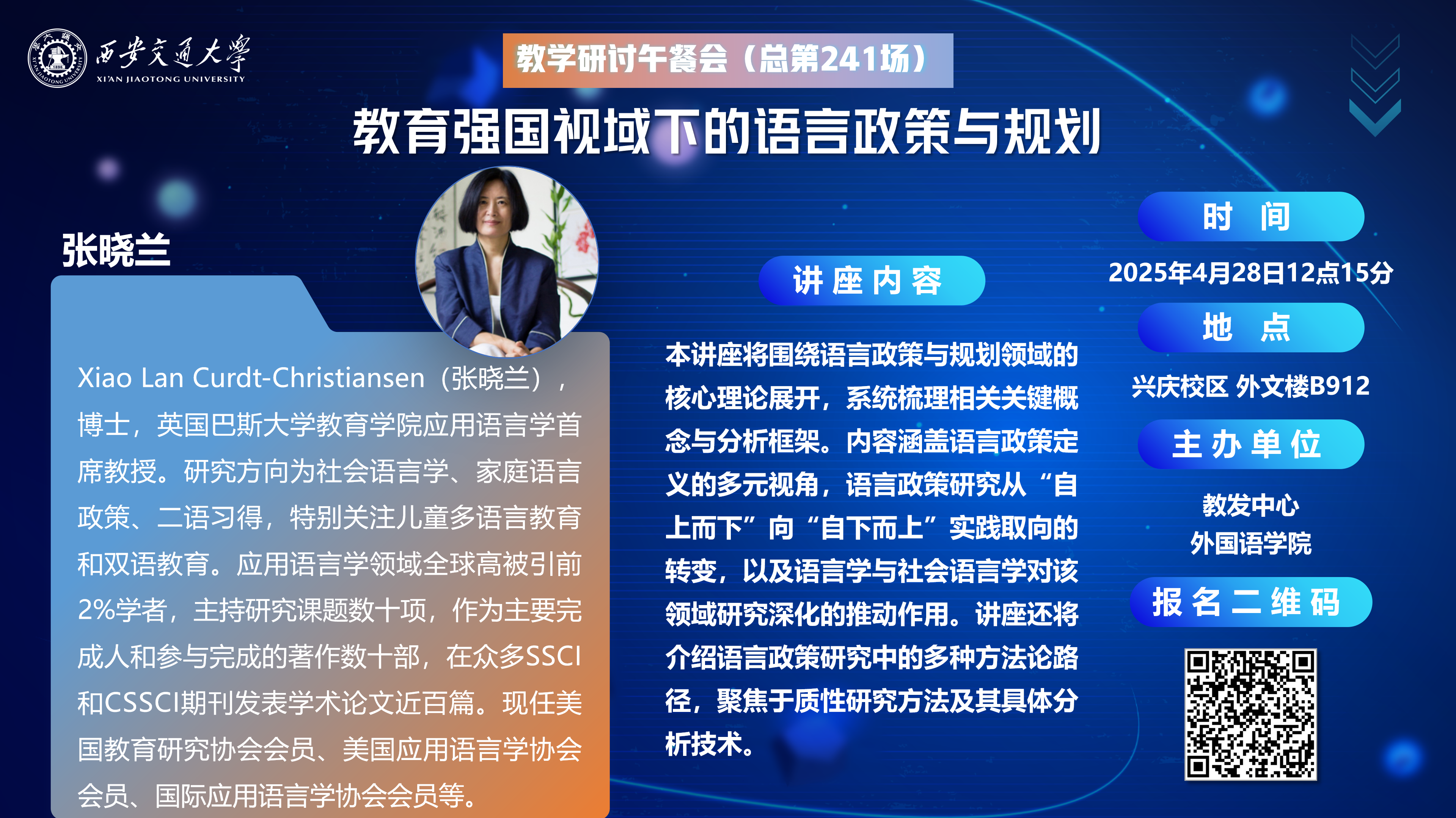 本讲座将围绕语言政策与规划领域的核心理论展开,系统梳理相关关键概念与分析框架。内容涵盖语言政策定义的多元视角,语言政策研究从“自上而下”向“自下而上”实践取向的转变,以及语言学与社会语言学对该领域研究深化的推动作用。讲座还将介绍语言政策研究中的多种方法论路径,聚焦于质性研究方法及其具体分析技术。。