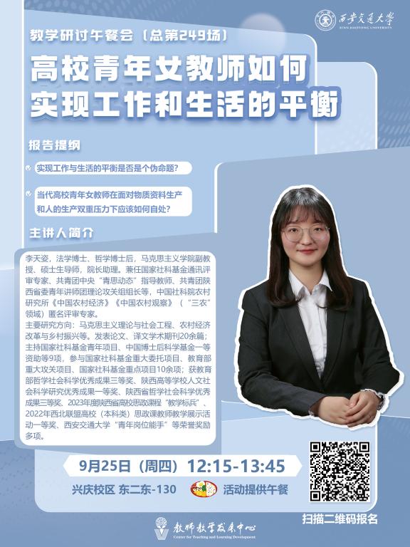 李天姿,法学博士、哲学博士后,马克思主义学院副教授、硕士生导师,院长助理。兼任国家社科基金通讯评审专家、共青团中央“青思动态”指导教师、共青团陕西省委青年讲师团理论攻关组组长、MEGA2日本仙台编辑小组研究员(2019-2020)、中国社会学会工业社会学专业委员会委员、西安交通大学社会工程研究中心秘书长、西安市伦理协会副秘书长,中国社科院农村研究所《中国农村经济》《中国农村观察》(“三农”领域)匿名评审专家。