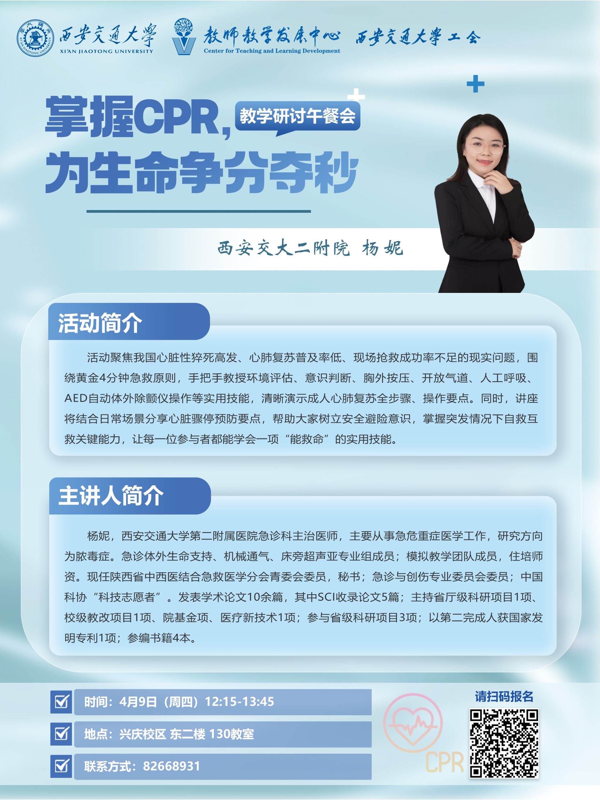 活动聚焦我国心脏性猝死高发、心肺复苏普及率低、现场抢救成功率不足的现实问题,围绕黄金4分钟急救原则,手把手教授环境评估、意识判断、胸外按压、开放气道、人工呼吸、AED自动体外除颤仪操作等实用技能,清晰演示成人心肺复苏全步骤、操作要点。同时,讲座将结合日常场景分享心脏骤停预防要点,帮助大家树立安全避险意识,掌握突发情况下自救互救关键能力,让每一位参与者都能学会一项“能救命”的实用技能。