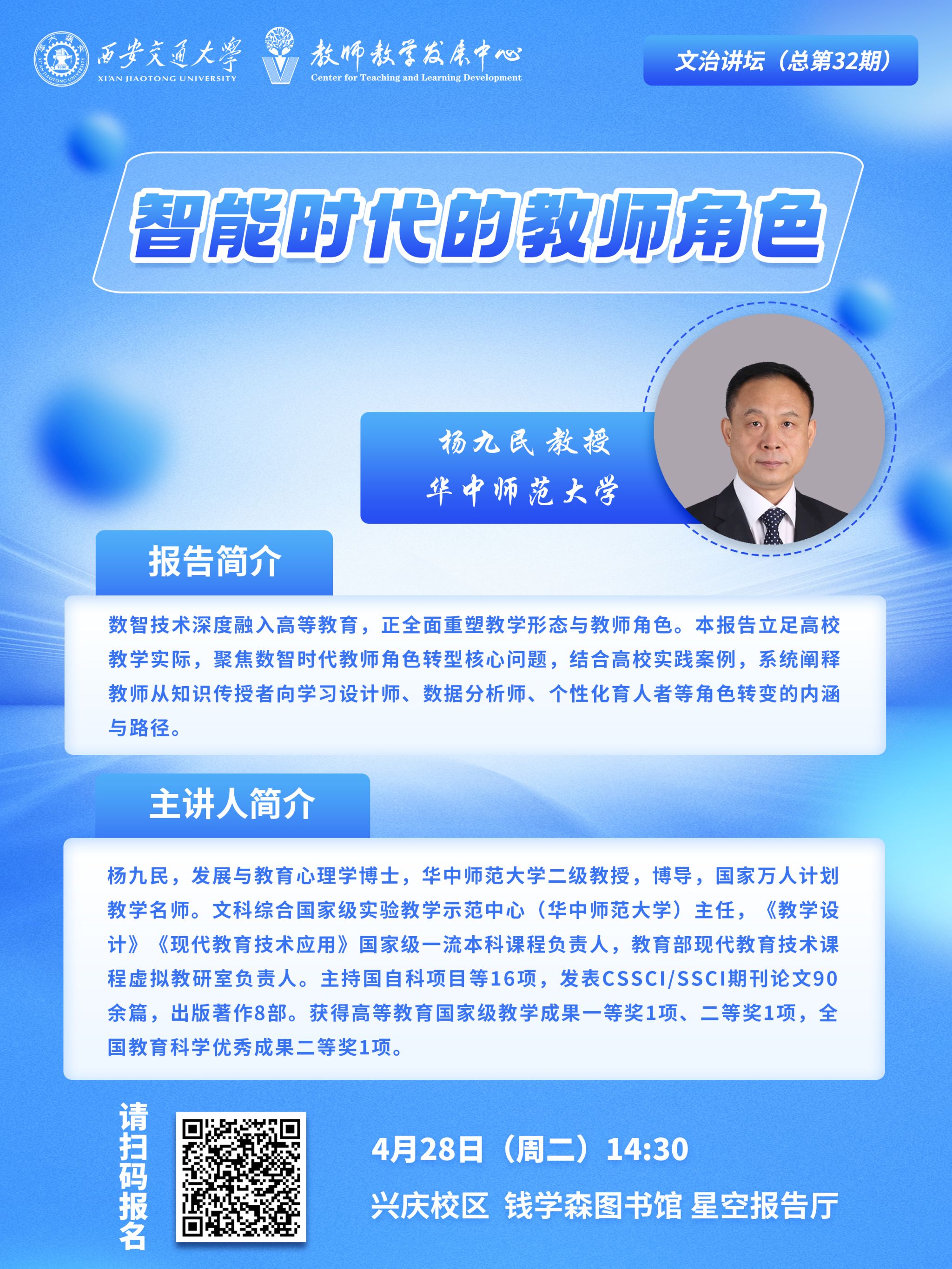 杨九民,发展与教育心理学博士,华中师范大学二级教授,博导,国家万人计划教学名师。文科综合国家级实验教学示范中心(华中师范大学)主任,《教学设计》《现代教育技术应用》国家级一流本科课程负责人,教育部现代教育技术课程虚拟教研室负责人。主持国自科项目等16项,发表CSSCI/SSCI期刊论文90余篇,出版著作8部。获得高等教育国家级教学成果一等奖1项、二等奖1项,全国教育科学优秀成果二等奖1项。