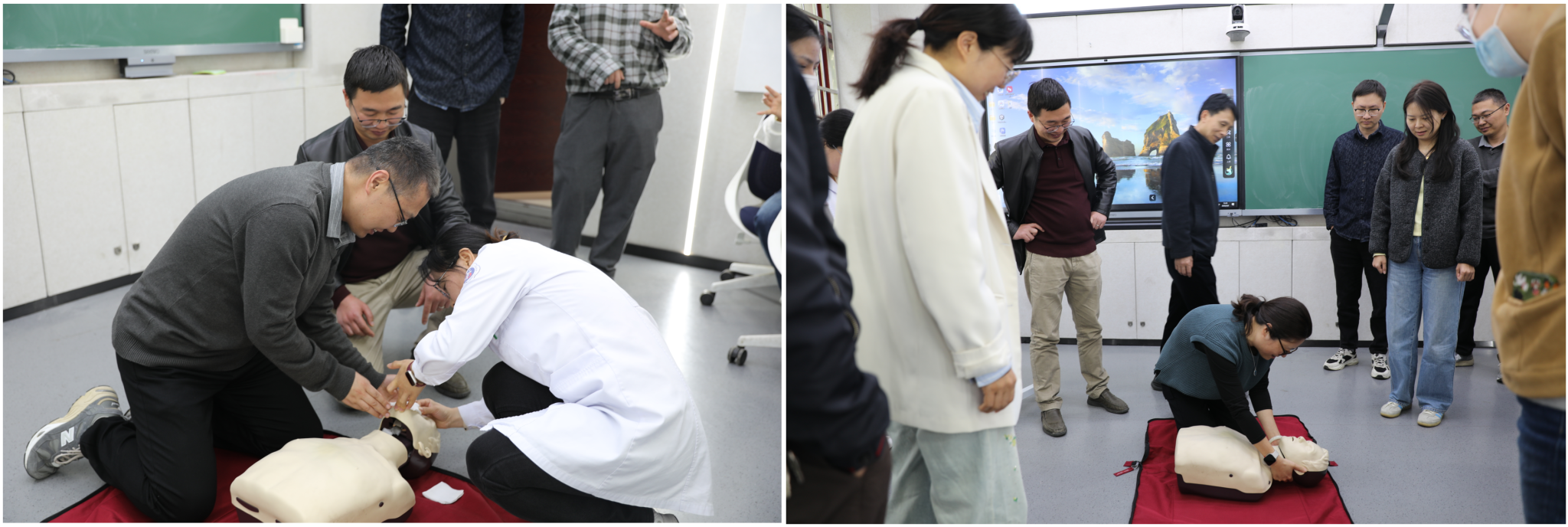 实操演练环节,杨妮现场使用模拟人进行标准化示范,逐一规范动作细节,随后组织教师开展实操练习。在老师们动手操作的过程中,杨妮全程指导,耐心纠正按压位置不准、吹气力度不当、按压与通气比例错误等问题,确保每位教师都能熟练掌握规范流程。从胸外按压的深度与频率把控,到人工呼吸的气道开放技巧,每一个动作都反复打磨、精准到位,现场学习氛围浓厚,互动交流热烈。